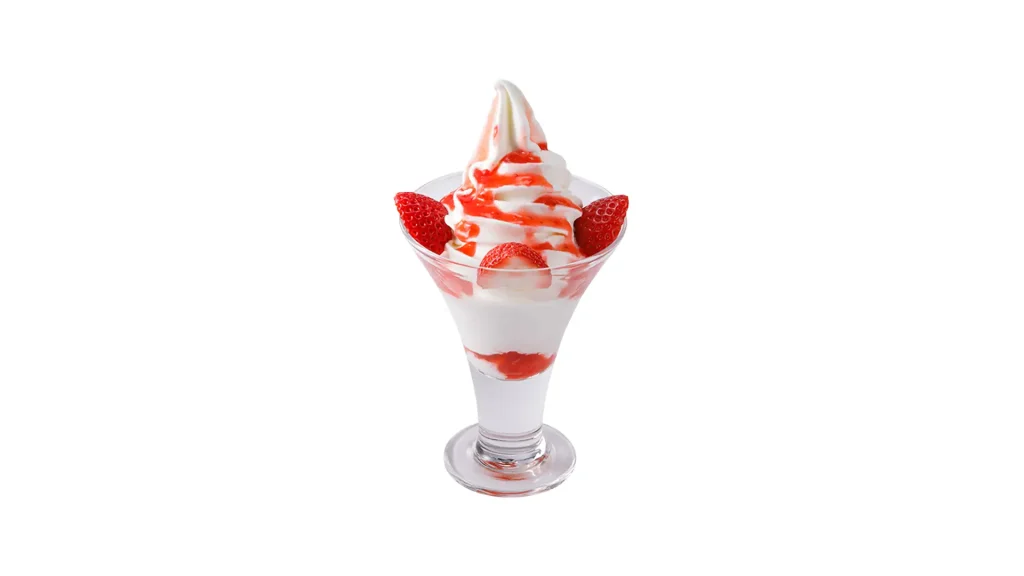 北海道ソフトクリームにいちごソースを絡めて完熟いちごをトッピングした、食後にぴったりな小さめサイズのデザートです。