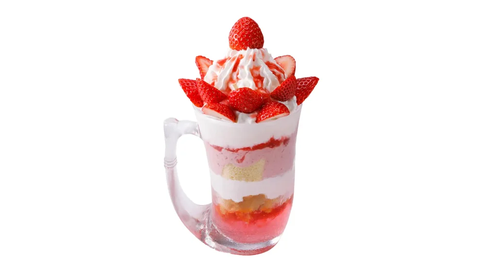 完熟いちごを7粒使用し、いちごのマスカルポーネいちごゼリーの他、シフォンケーキ、ホイップクリーム、アイスクリームなどを大きなジョッキに詰め合わせた満足感のある一品です。