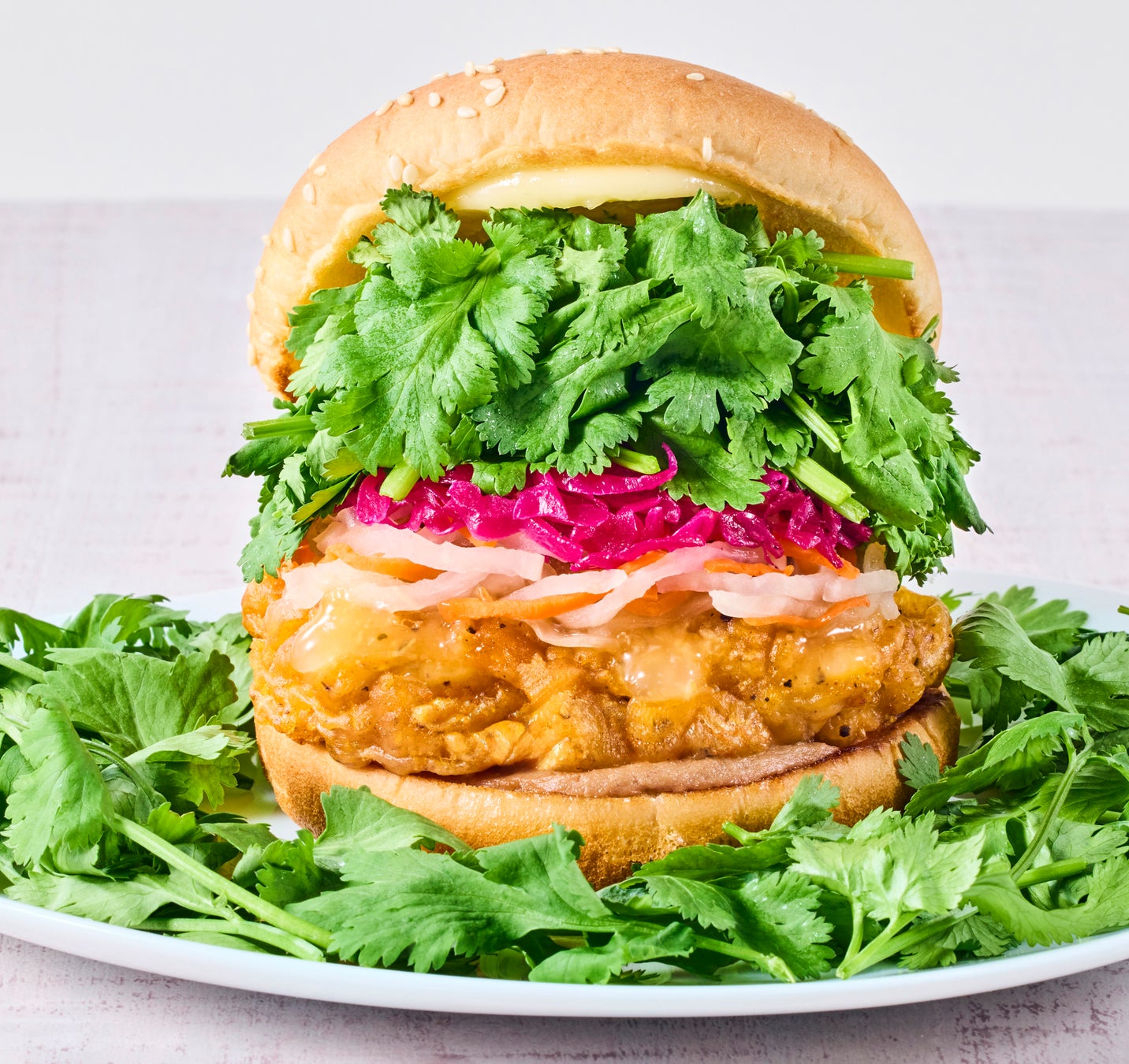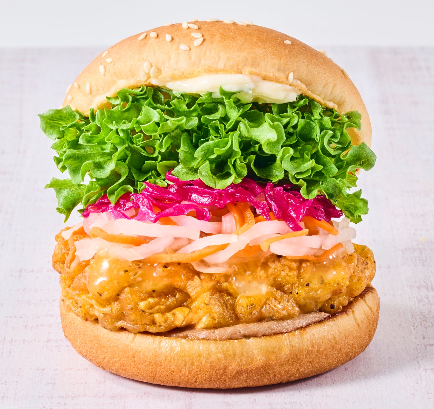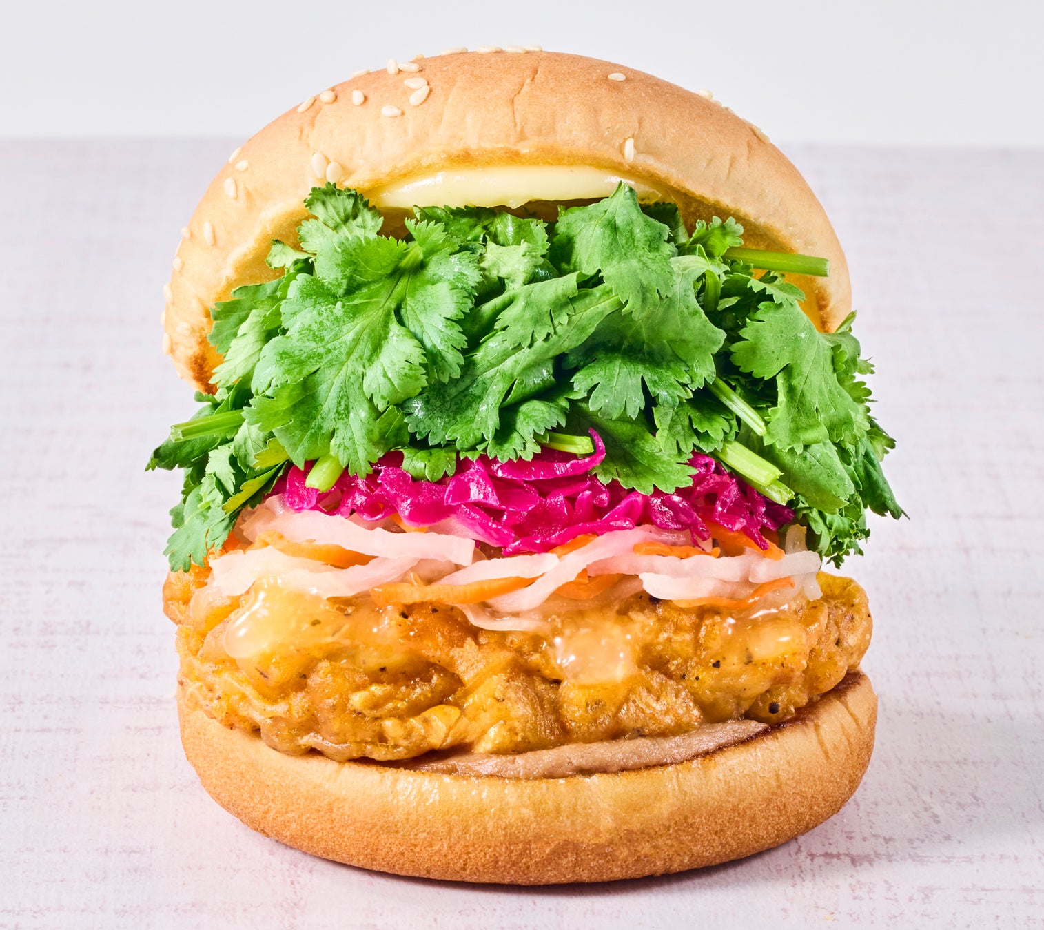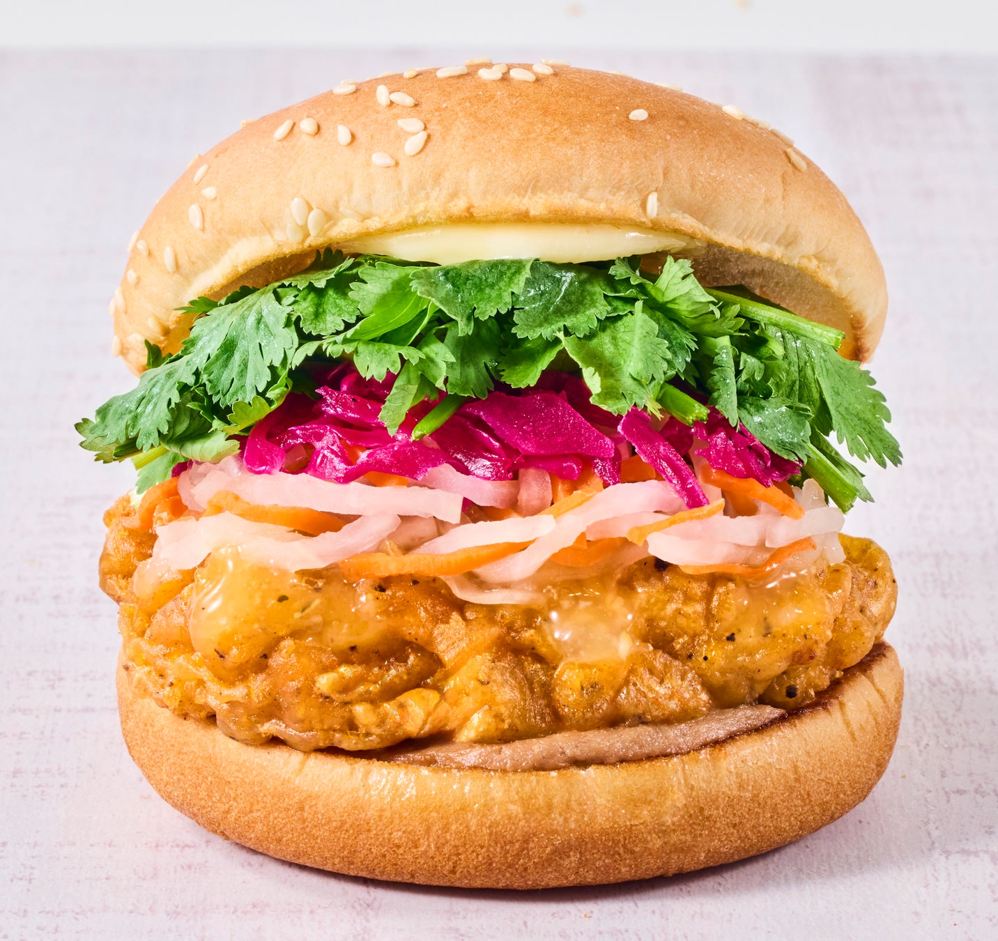 ベトナムサンドイッチのバインミーをハンバーガーで再現。店内調理のジューシーなクリスピーチキンに濃厚レバーペースト、ほど良い酸味のなます、紫キャベツのマリネをトッピング。ほんのり甘くてスパイシーな香りが特徴の五香粉(ウーシャンフェン)とナンプラーを使用し、本場に近い味わいを再現しました。