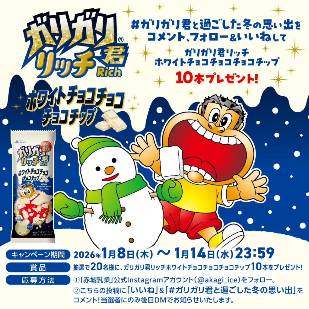 「赤城乳業公式X」「赤城乳業公式Instagram」のキャンペーン投稿に対して、以下方法で応募いただいた方を対象に、抽選で20名様にガリガリ君リッチホワイトチョコチョコチョコチップ10本をプレゼントするキャンペーンを実施いたします。