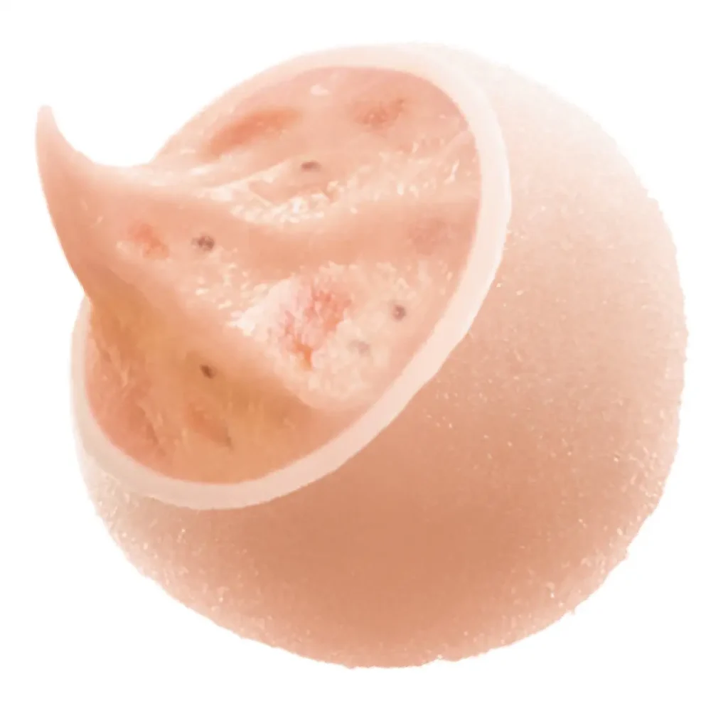 フルーツフレーバーには、これからの季節に旬を迎える苺を採用。甘みと華やかな香りが特長の栃木県産苺「とちあいか」をブレンドした苺果汁を使用しています。また、つぶつぶ食感の苺果肉を練り込むことで、素材感あふれる味わいに仕上げました。さらに、外側のコーティング部分にも国産苺エキスを使用し、一口目からジューシーで甘酸っぱい素材本来のおいしさを楽しめます。