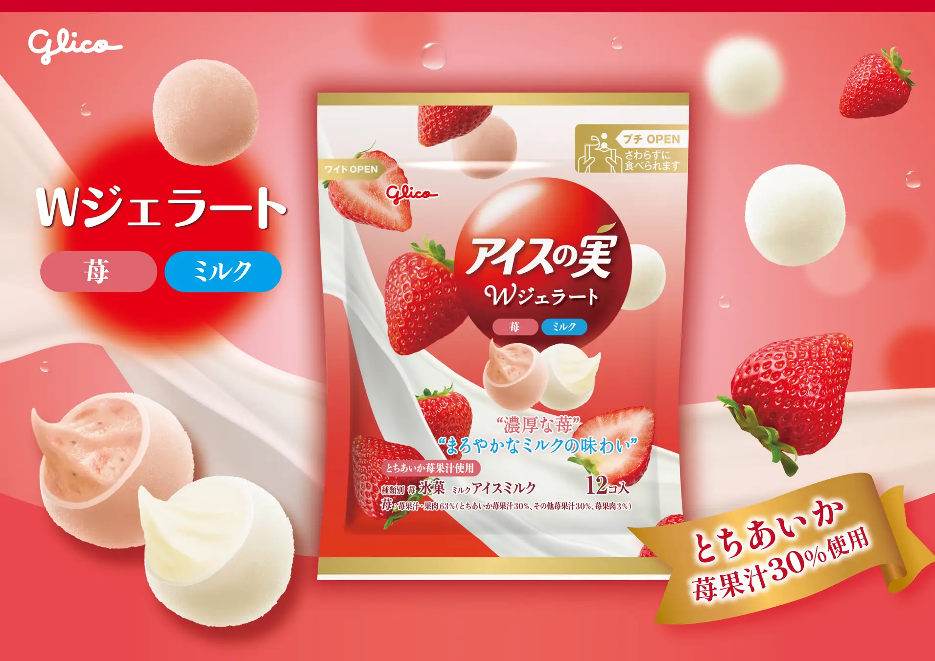 江崎グリコ株式会社は、ぎゅっと凝縮された素材の濃い味わいが特長のロングセラーブランド「アイスの実」から、1袋で苺とミルクの2つの味が楽しめる「アイスの実Wジェラート<苺・ミルク>」を、2025年11月24日(月)より全国にて期間限定発売します。