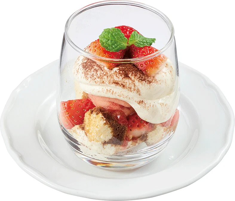 サクサクのメレンゲとほろ苦いコーヒーをたっぷり染み込ませたスポンジ、ストロベリージェラート、チーズ風味のムースを重ね、フレッシュな苺をトッピングしました。コーヒーの香りとムースのコク、苺の甘酸っぱさが絶妙に調和した、ティラミス仕立てのドルチェです。ティータイムにもおすすめの贅沢ドルチェをお楽しみください。
