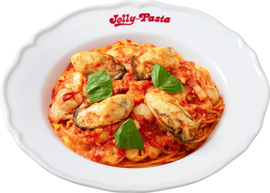 にんにくと唐辛子をきかせたピリ辛トマトソースのパスタに、モッツァレラチーズ、ベーコンを加え、ミルキーな味わいの播磨灘産牡蠣を合わせた一品です。牡蠣はじっくりソテーしているため、トマトソースにも牡蠣の旨みがたっぷり。バジルのフレッシュな香りはトマトソースのパスタと相性抜群です。ジョリーパスタの“人気No.1メニュー”と冬の味覚“牡蠣”のコラボレーションをぜひお楽しみください。