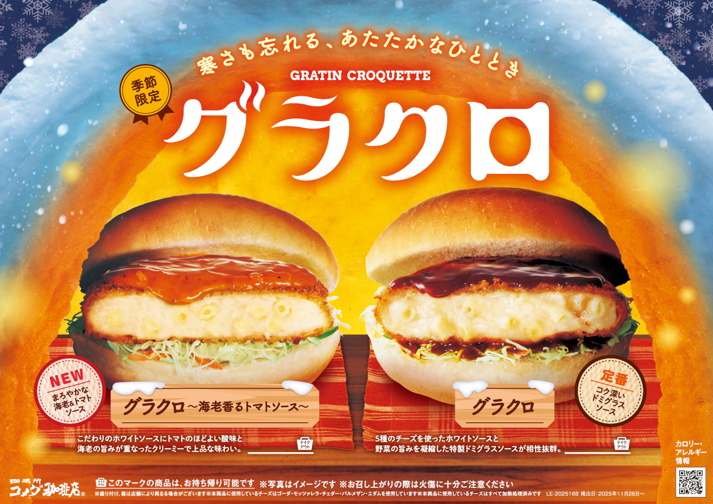 コメダ珈琲店(コメダ)は、季節限定バーガー「グラクロ」と新作「グラクロ~海老香るトマトソース~」を11月26日から2026年1月中旬(予定)まで販売する。