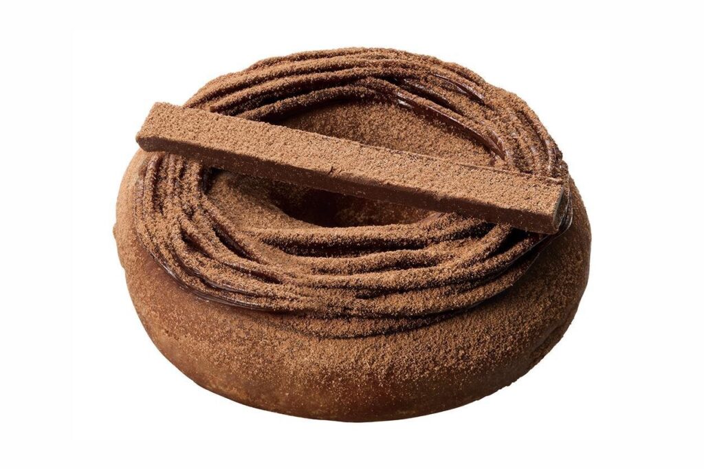 ふわっとしたチョコ生地のリングに、生チョコを練りこんだなめらかなチョコクリームをモンブラン風にぐるり。パリッと食感のほんのりビターな板チョコをのせて、ココアシュガーをかけました。