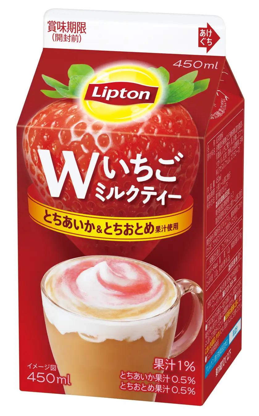 「リプトン Wいちごミルクティー」は、2種類のいちご果汁の甘酸っぱさと、世界の茶の専門家「リプトン」が厳選した茶葉を100%使用した香り豊かな紅茶が楽しめる、満足感ある味わいのミルクティーです。味わいの異なる”とちあいか”と”とちおとめ”の2種類のいちご果汁を使用し、ミルクティーにマッチするよう絶妙なバランスに仕上げました。