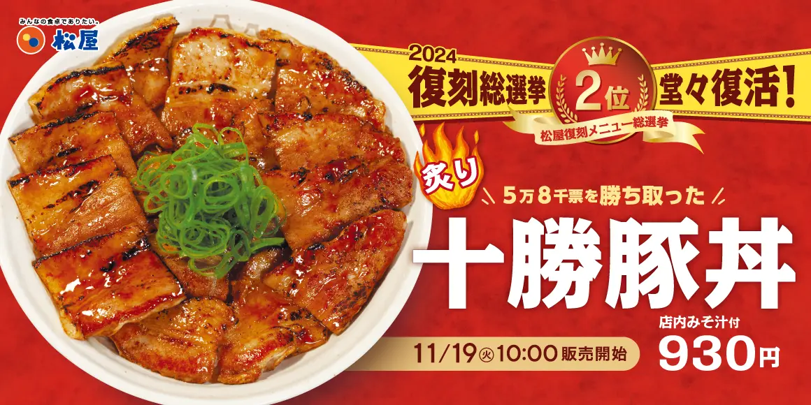 【松屋】復刻メニュー総選挙 第2位の人気丼「炙り十勝豚丼」発売!厚切りの豚カルビと濃厚ダレ、炙りの香ばしさが人気の逸品!11月19日(火)午前10時より販売開始!