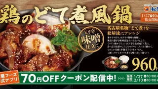 【松屋】特製味噌で味わう名古屋名物「鶏のどて煮風鍋」1月27日(火)より発売!名古屋名物グルメを松屋流にアレンジ!ピリ辛で濃厚な味噌仕立てのごろごろチキンを熱々のお鍋でご提供!
