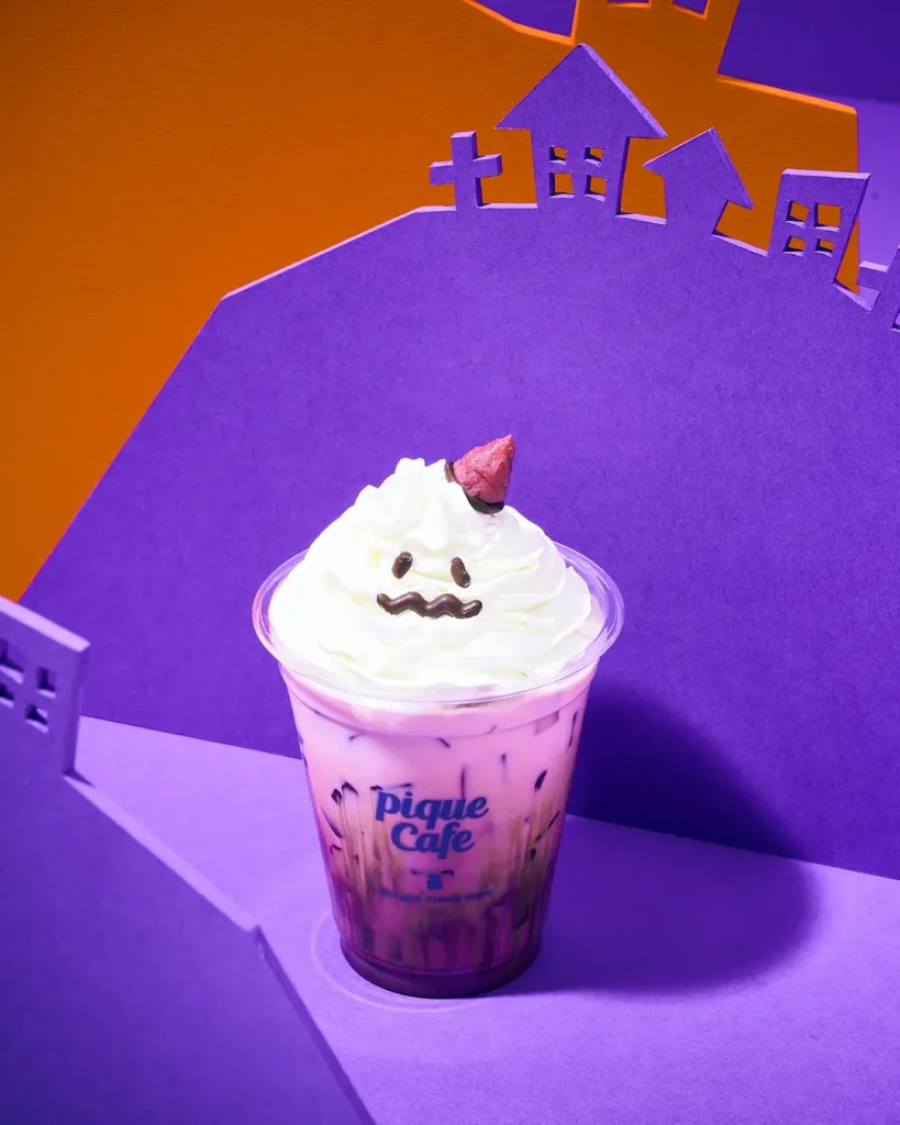 紫芋シロップとミルクが混ざり合い、まろやかで奥深い甘さが口いっぱいに広がるゴーストラテ。カップの側面にはチョコソースでグラデーションが描かれ、ハロウィン気分を盛り上げます。ラテの上にはふんわり泡立てたエスプーマをのせて、そこにチョコで描いたゴーストの表情がとってもキュート。頭にはチョコと紫芋クリームでできた帽子がトッピングされ、見た目の愛らしさも抜群です。